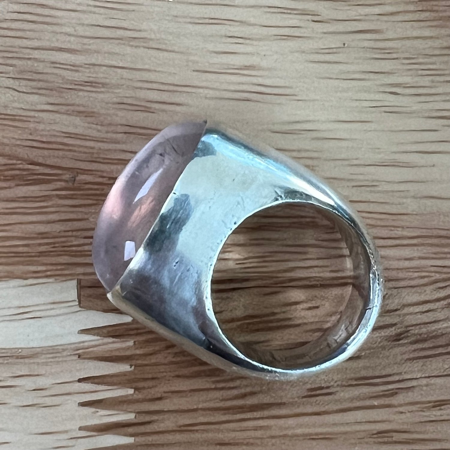 This is a hand-carved, one-of-a-kind ring, cast in solid sterling silver. It was designed to match the curves of the lovely rose quartz cabochon that crowns it.
